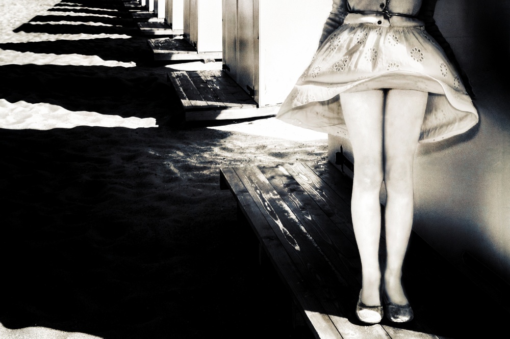 While shooting on the beach I saw interesting light and shadows on the beach cabins. I took some shots focussing on the combination of the young model in contrast with the graphical component of the cabins. As the light was rather challenging I used fill-in flash . For this shot a sudden wind came to help me in getting this special moment.